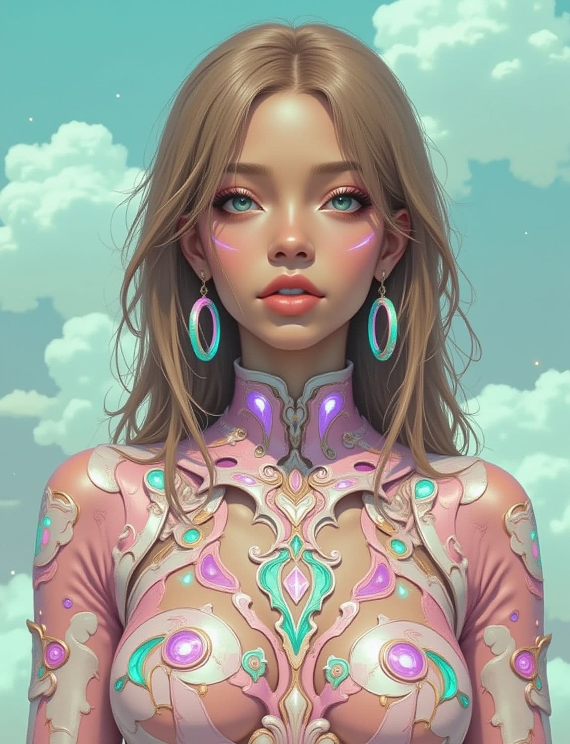 A futuristic young woman with striking blue eyes adorned with ethereal makeup, including glowing pink lines on her cheeks and vibrant pink eyeshadow. She wears large, ornate earrings and her outfit is a highly detailed, armor-like attire with pastel colors, featuring intricate patterns and glowing jewels in shades of purple and turquoise. The background is a serene sky with fluffy clouds.