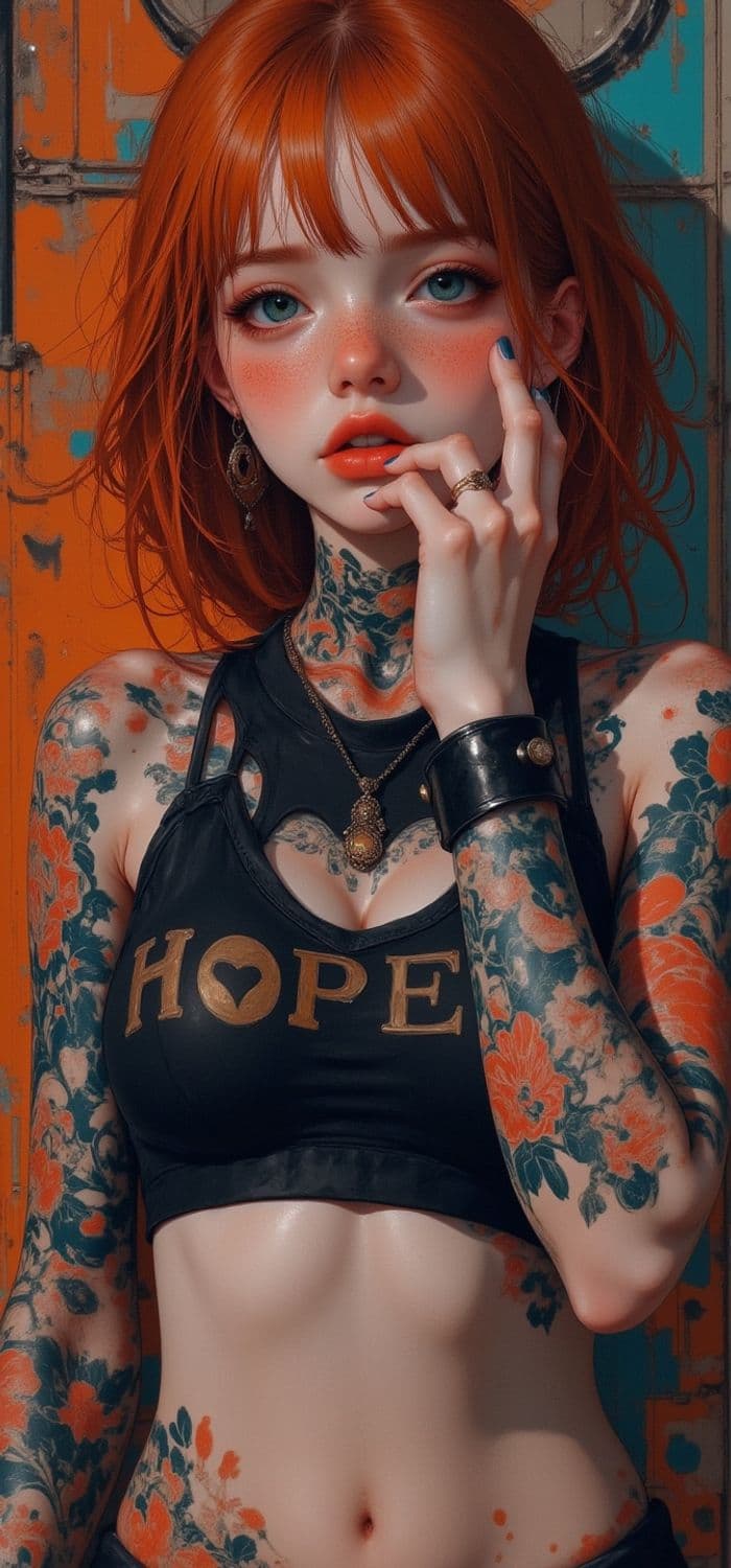 A vibrant portrait of a young woman with striking red hair set against a colorful, patterned background. She wears a black top with 'HOPE' inscribed on it, paired with eye-catching floral tattoos covering her arms and neck. Her large, expressive eyes and bold makeup give her an enchanting appearance. Accessories include dangling earrings, rings, and a pendant necklace.