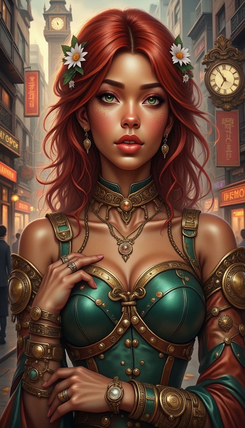 A captivating character with striking red hair adorned with white flowers, wearing elegant green and gold armor. She stands in a busy, historical urban setting featuring ornate architecture and a prominent clock tower in the background. Her pose is confident and poised, complemented by intricate jewelry and accessories.