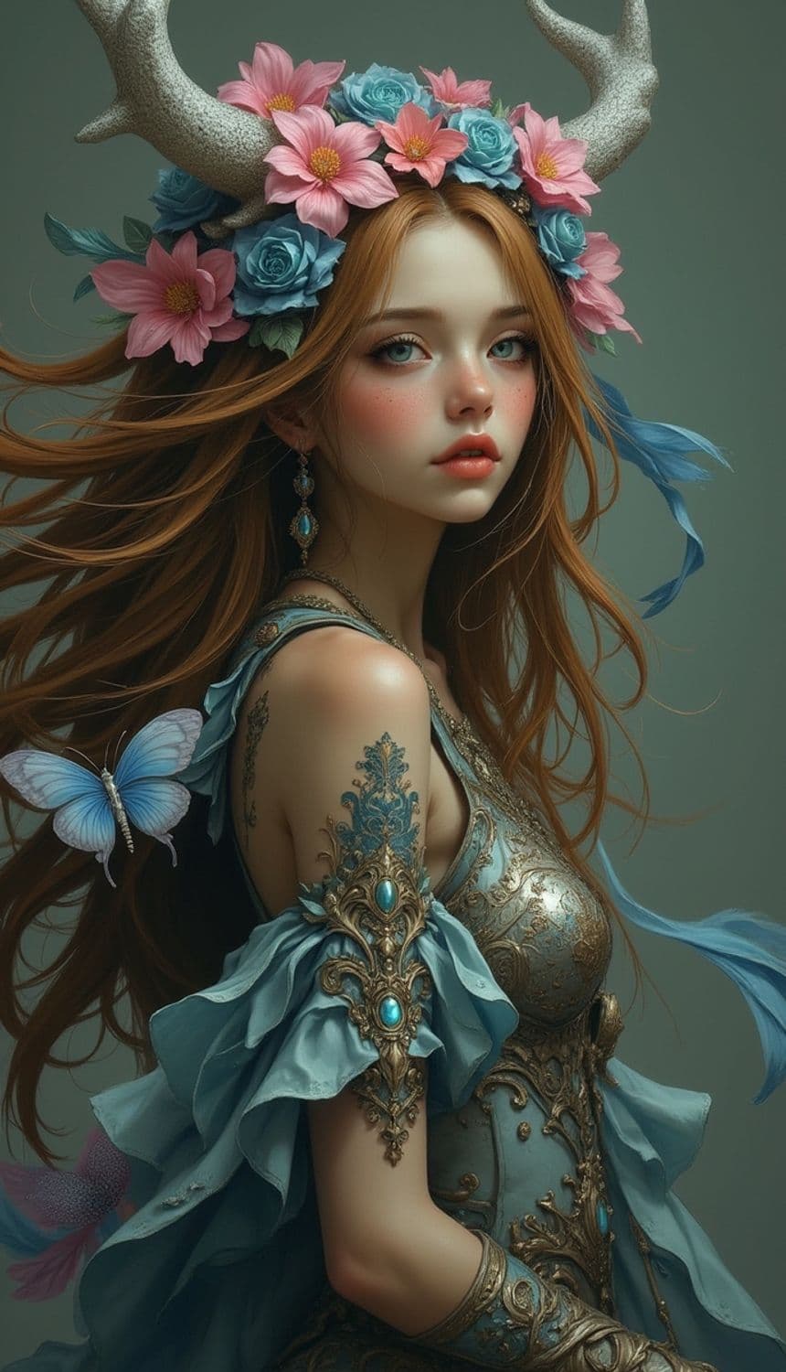 A mystical woman with flowing red hair is adorned with an ornate headdress that features antlers and a vibrant array of flowers in blue and pink. She wears a beautifully detailed armored garment with blue and gold embellishments. A delicate butterfly rests on her shoulder, matching the serene, magical atmosphere surrounding her.