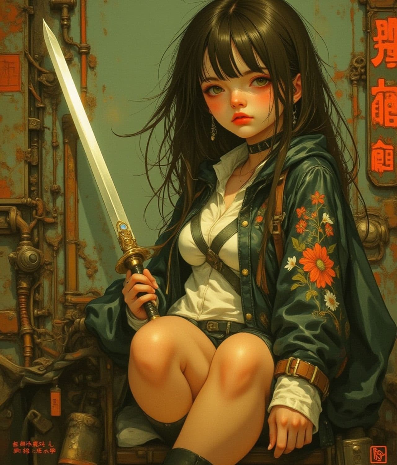 The illustration features a young woman with long dark hair sitting confidently with a sword in hand. She is wearing a dark jacket with embroidered flowers, a white shirt, and a choker. Her expression is serious, and she sits against a backdrop with intricate mechanical details and rusty hues.