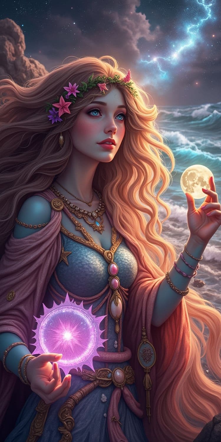The image depicts a mystical, fantasy-themed scene focused on a female figure with long, flowing blonde hair accentuated with a floral wreath of pink and purple flowers. She wears a detailed outfit with elements of gold and gems, featuring a blue dress with a pink cape draped over her shoulders. Her attire is adorned with intricate jewelry and embellishments. Her eyes are a striking blue, highlighted by a soft, ethereal glow. In her hands, she holds two spheres: one resembling a glowing moon on one side and a vivid purple magical orb on the other, emitting a bright, mystical aura. The background showcases a starry night sky with soft clouds and a hint of a bright, swirling galaxy or nebula. In the distance, waves crash gently against a shore, adding a dynamic yet serene element to the scene. The overall color palette is a harmonious blend of blues, purples, and golds, giving the image an enchanting and otherworldly atmosphere, typical of fantasy digital art styles.