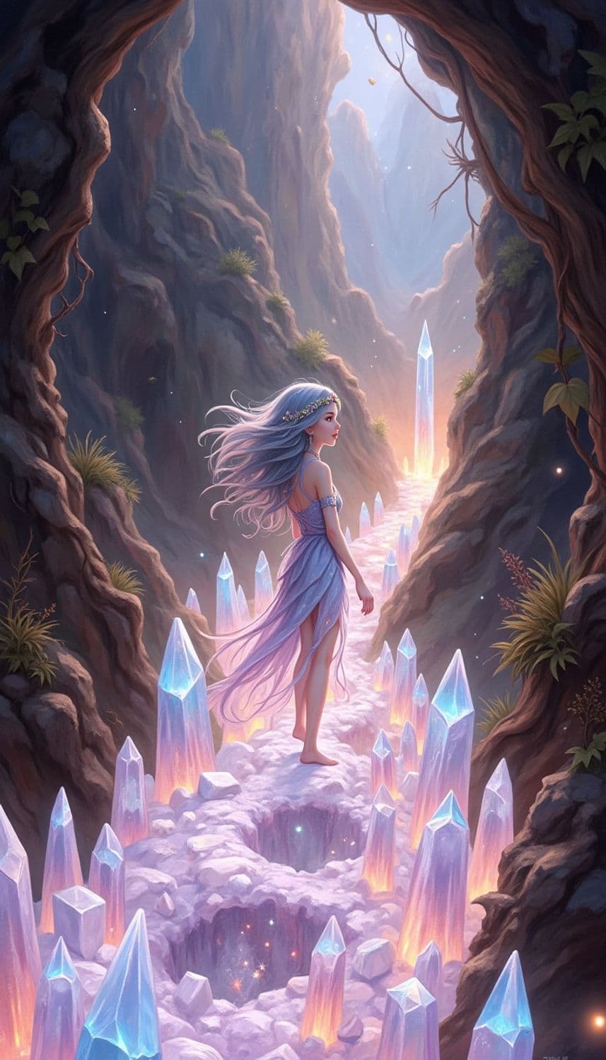 In a mystical, ethereal realm of floating, luminescent crystal caverns under a sky painted with the colors of a serene dawn, a captivating female figure stands poised on a shimmering, translucent crystal bridge. Her attire is a flowing, elegant gown crafted from a fabric that seems to capture the essence of dawn's embrace, blending shades of soft periwinkle and shimmering silver. Her hair, a striking shade of dawn silver, cascades down her back in intricate, flowing waves, framing a face with delicate, serene features and a gentle, enigmatic smile. Her eyes, a mesmerizing shade of crystal blue, seem to reflect the mysteries of the cavernous world. She wears a delicate diadem adorned with tiny, luminescent crystals and silver vines, enhancing her celestial and otherworldly presence. The background is a breathtaking scene of luminescent crystal caverns and gentle, glowing streams of dawn light that weave through the realm, creating a serene and enchanting atmosphere. The style is a blend of fantasy and crystalline elegance, with a focus on cool color tones and intricate detailing, creating a mesmerizing and otherworldly atmosphere.