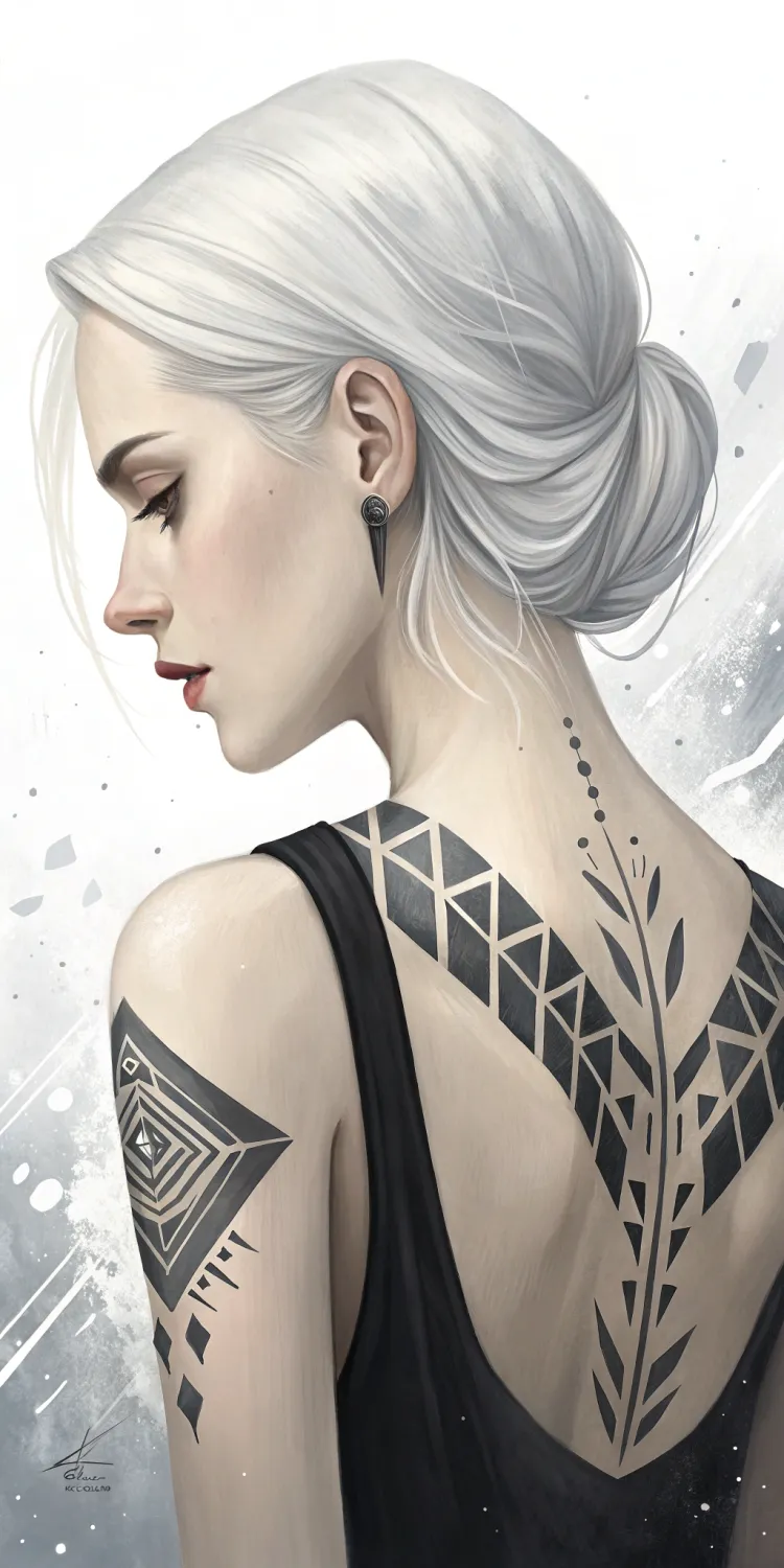 A beautiful digital painting of a woman gazing over her shoulder, her hair a sleek sheet of silver. Her skin is a pale ivory, and she wears a minimalist, black dress. Her back is adorned with a tattoo of abstract geometric patterns in black and silver. The background is a stark white, with subtle hints of metallic textures. The style combines elements of Nordic art with a minimalist, modern approach, focusing on the stark contrast and elegance of the tattoo art.