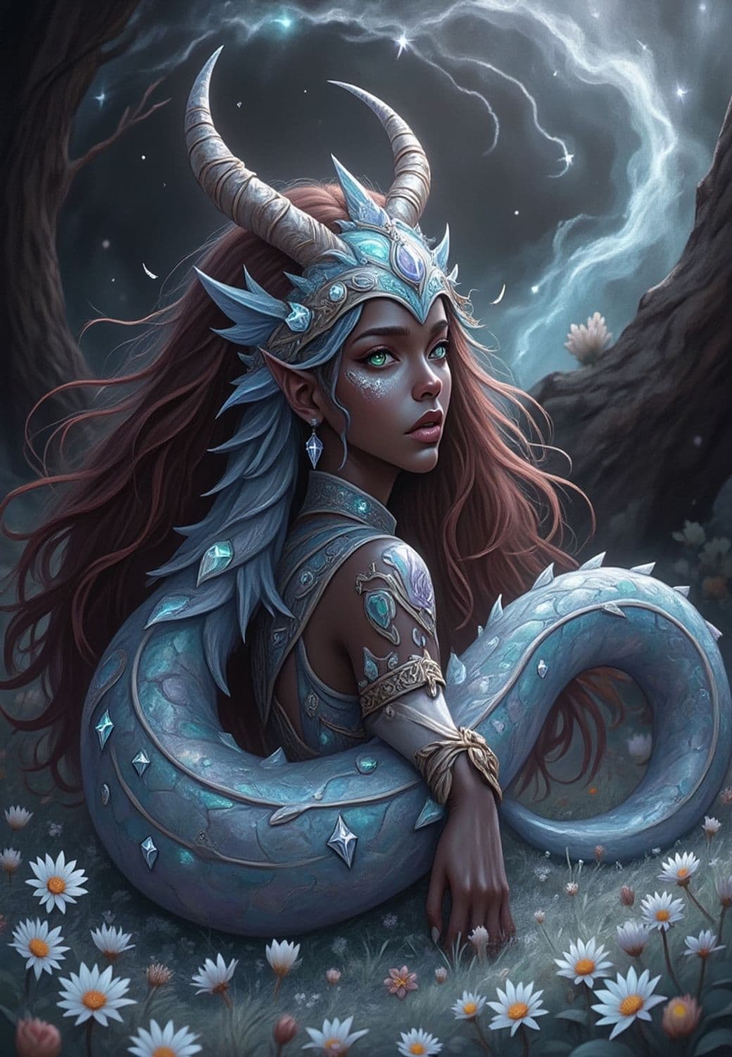 A mystical creature with a serpentine body adorned with shimmering scales and jeweled embellishments emerges from a meadow filled with daisies. She has long, flowing hair, pointed ears, and wears an ornate headdress with curved horns and gleaming gemstones. Her intense green eyes gaze into the distance, set against a backdrop of swirling mist and starry night sky.