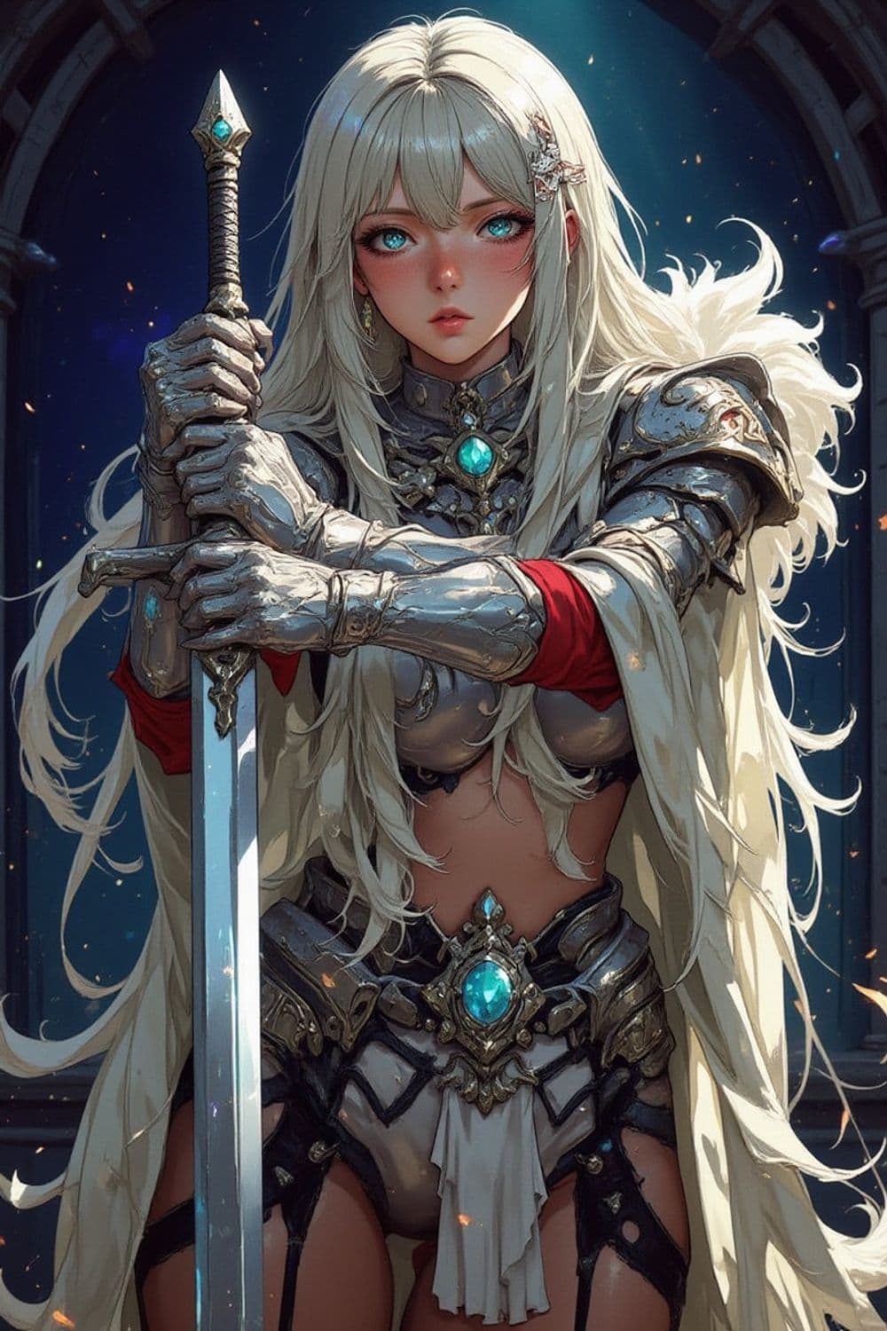 A regal armored figure with long flowing white hair stands confidently holding a sword. Their piercing blue eyes and intricate silver armor adorned with blue gems highlight a mystical presence. The setting is dark with glowing embers creating a majestic and enchanted atmosphere.