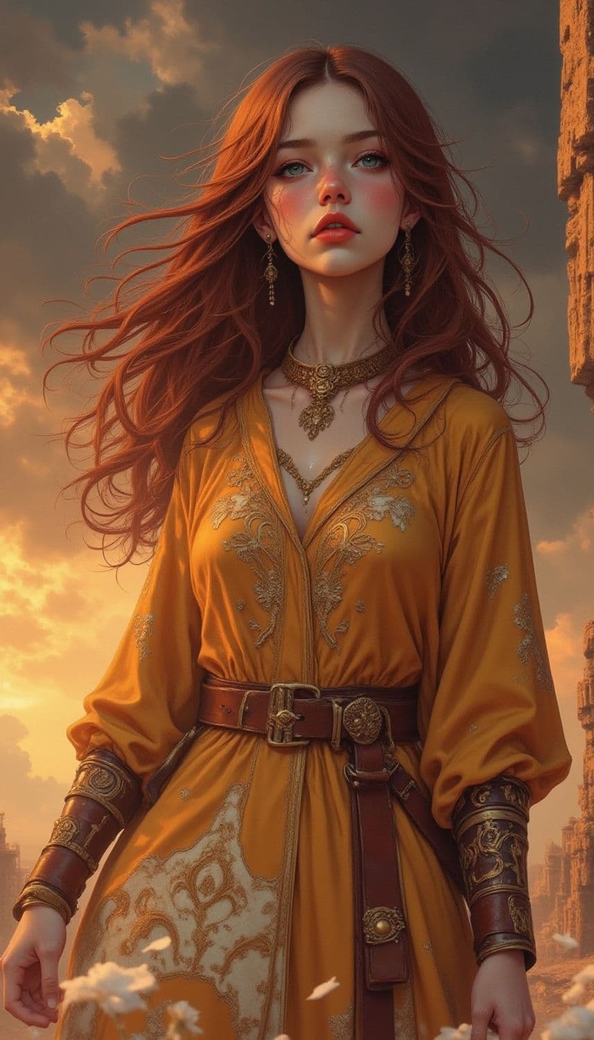 A captivating portrait of a woman with long, flowing red hair. She wears an ornate golden dress with intricate embroidery and large, elaborate jewelry. The backdrop is a dramatic sky at sunset, with clouds tinged in warm hues. Her expression conveys a sense of calm and strength.