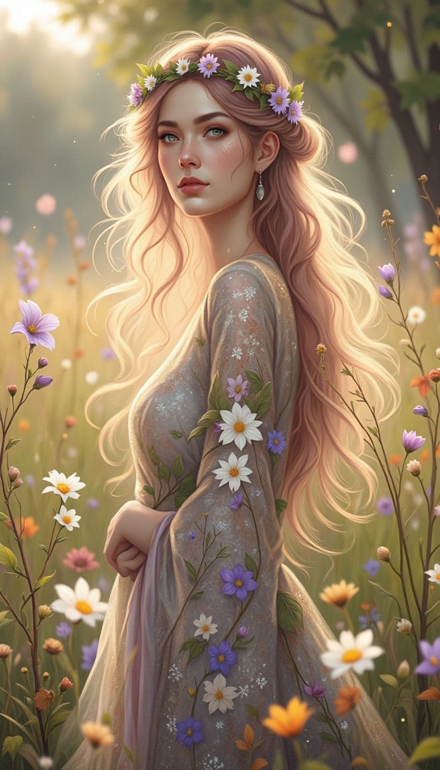 In a hidden, enchanted meadow at dawn, a mesmerizing female figure stands amidst a sea of dew-kissed wildflowers and delicate morning mist. Her attire is a flowing gown crafted from shimmering, translucent fabric that captures the hues of the early morning sky, blending shades of soft lavender and pale gold. Her hair, a radiant shade of dawn pink, cascades down her back in soft waves, framing a face with delicate, serene features. Her eyes, a captivating shade of sunrise amber, seem to reflect the first light of day. She wears a delicate garland made of morning glories and tiny, twinkling dewdrops, enhancing her ethereal and otherworldly presence. The background is a breathtaking scene of lush meadows and gentle, rolling hills bathed in the soft glow of the rising sun, creating a serene and enchanting atmosphere. The style is a blend of fantasy and natural elegance, with a focus on soft color tones and intricate detailing, creating a mesmerizing and otherworldly atmosphere.
