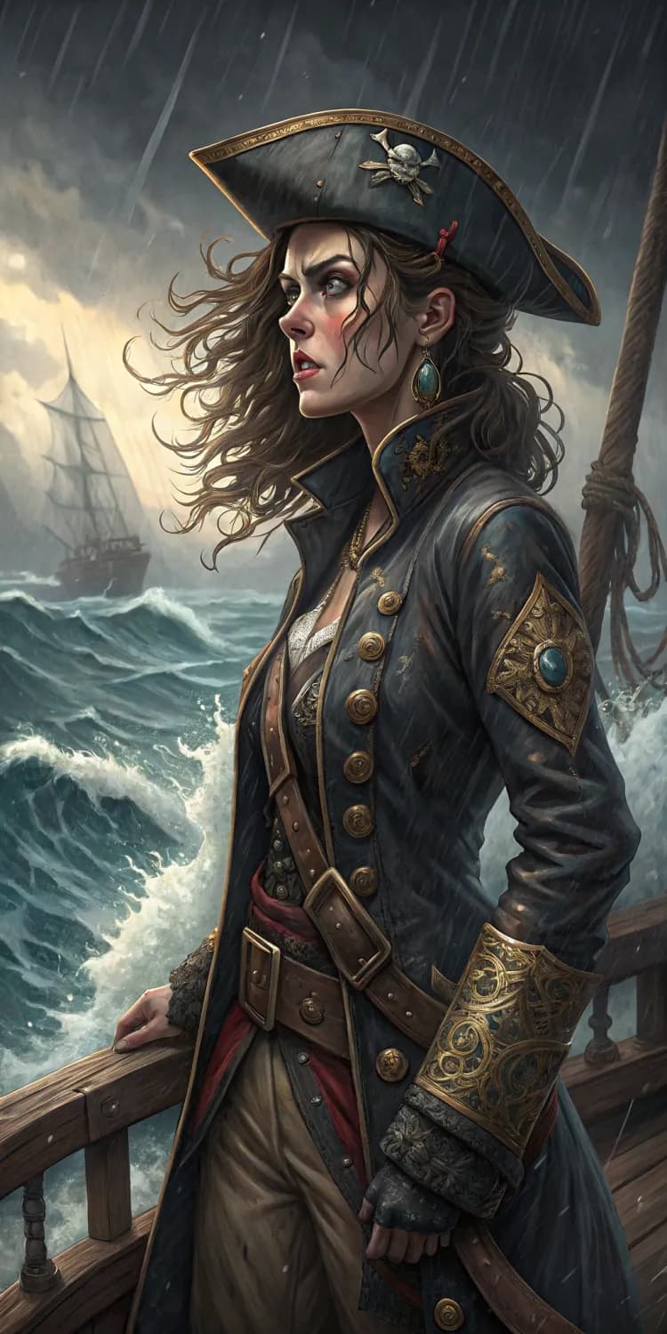 The image features a female pirate captain in a rugged, weathered outfit, standing on the deck of a ship amidst a stormy sea. Her attire includes a tricorn hat, a leather coat with gold embroidery, and a cutlass at her side. The character's curly, dark brown hair is windswept by the sea breeze. Her expression is fierce and commanding, with dramatic makeup that accentuates her eyes. The background shows crashing waves and dark, ominous clouds, creating a tense, adventurous atmosphere. The art style incorporates realistic details with a swashbuckling, adventurous flair.