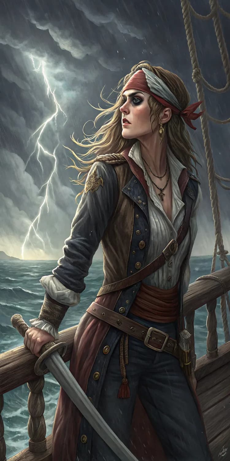 A fierce pirate captain stands on the deck of a ship, her gaze fixed on the horizon as a storm brews. Her outfit is a rugged ensemble of leather and cloth, adorned with nautical motifs and weathered by the sea. Her long, wild hair is caught in the wind, and she sports a bandana and an eye patch, adding to her swashbuckling persona. She grips a cutlass with determination, ready to face any challenge. The background features turbulent waves and a dramatic sky, capturing the spirit of adventure and danger. The style is hyper-realistic with a nautical fantasy touch, blending detailed maritime elements with a sense of daring escapade.