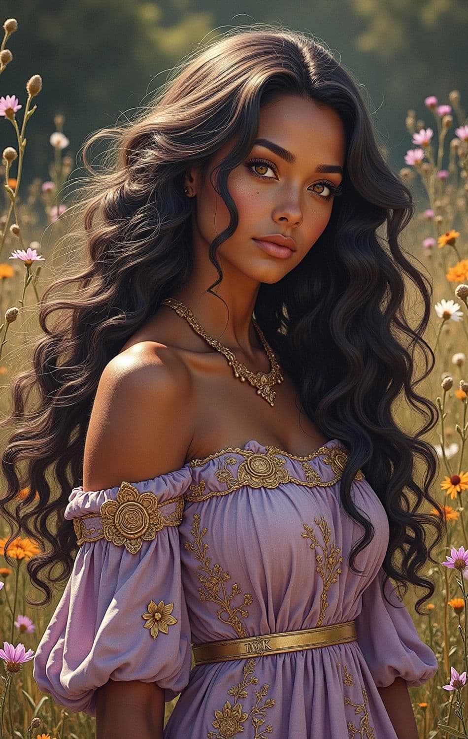 A close-up of a woman with voluminous, curly raven hair and deep mahogany skin. She is adorned in a flowing, lavender gown with gold filigree accents and an off-the-shoulder neckline. Her eyes are a striking amber, and she has a serene expression. The background is a sunlit meadow with wildflowers in full bloom, conveying a sense of peace and natural beauty. The style is inspired by Romanticism, combined with digital painting techniques, emphasizing soft textures and warm hues.
