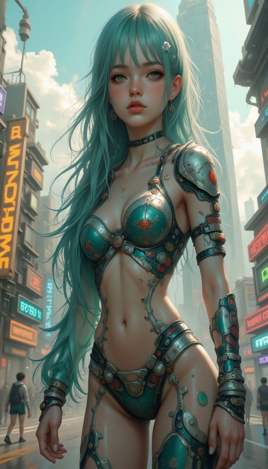 The image portrays a young woman with long teal hair and striking aqua eyes, wearing intricate metallic armor. Her attire is futuristic, with various metal plates and circuits embedded into her outfit. The background is a bustling cityscape with neon signs and towering buildings, giving the scene a cyberpunk aesthetic.