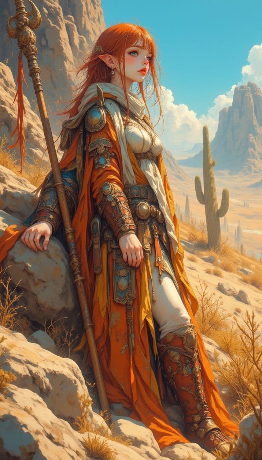 The image depicts a fantasy character with long red hair and pointed ears, dressed in elaborate armor with orange and gold tones. She leans against a rock in a desert landscape, holding a tall staff with intricate designs. The background features tall rock formations and cacti under a bright blue sky with fluffy clouds.