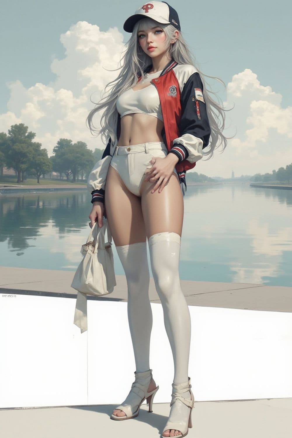A striking figure stands confidently by a serene waterway, under a bright blue sky with fluffy white clouds. The character has long silver hair flowing past her shoulders and wears a stylish mix of sporty and chic clothing. She dons a red and beige baseball jacket over a white cropped top, paired with high-waisted shorts. Her outfit is completed with thigh-high stockings and white high-heeled sandals. A baseball cap sits snugly on her head, providing a casual, laid-back touch. She carries a light-colored handbag, exuding a blend of elegance and athleticism.