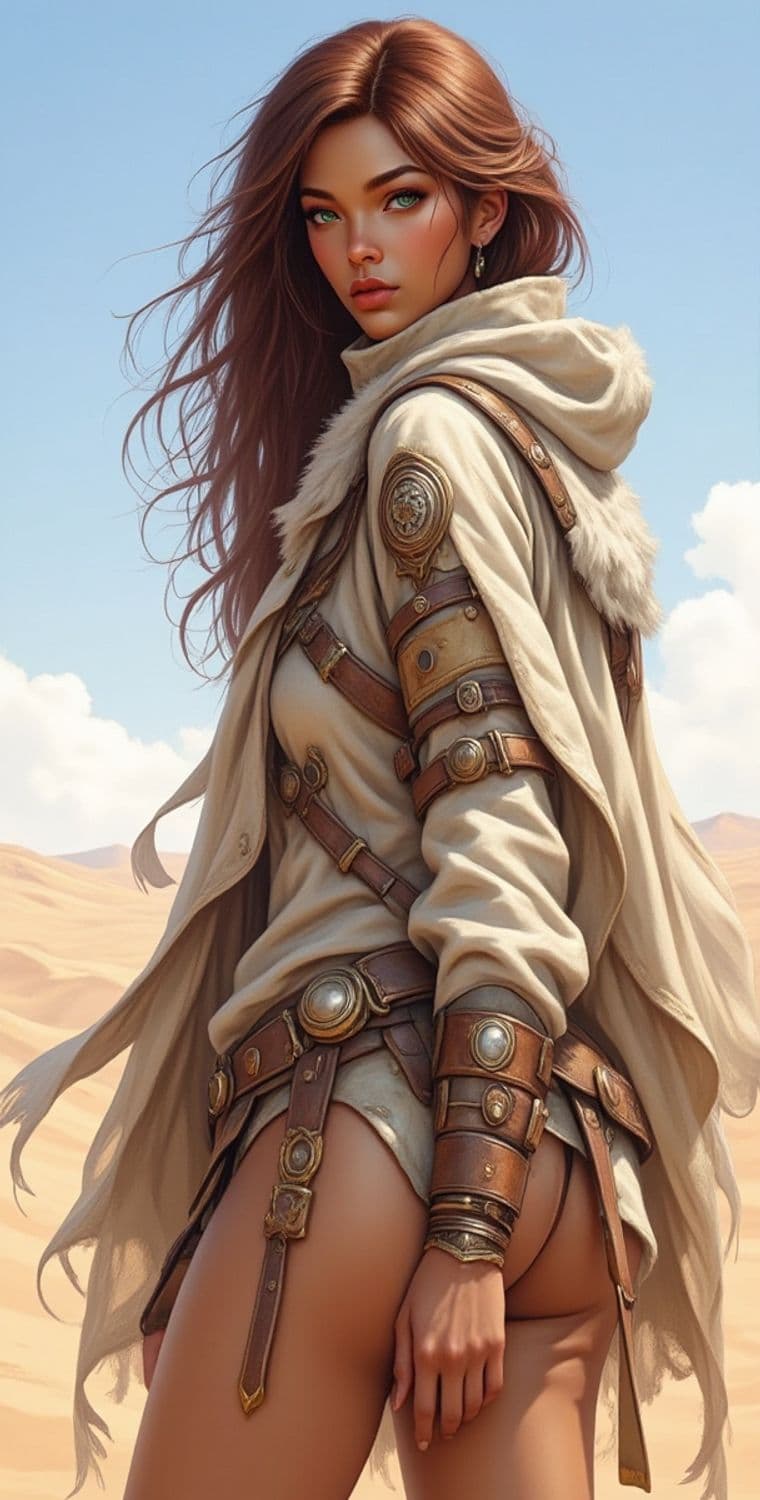 A mystical warrior with long brown hair and striking green eyes stands confidently in a desert landscape. She is dressed in a detailed outfit featuring a cream cloak with fur trim and leather armor adorned with metallic embellishments. The setting sun highlights the flowing fabric and intricate design of her attire.