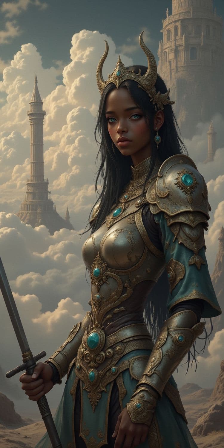 A regal figure clad in ornate armor stands confidently amidst an ethereal landscape of towering spires and billowing clouds. Her long dark hair cascades around a beautifully crafted crown adorned with blue jewels. The armor is intricately designed, with ornate patterns and highlighted by vibrant turquoise gems. In her hand, she firmly grips a sword, hinting at her readiness for action.