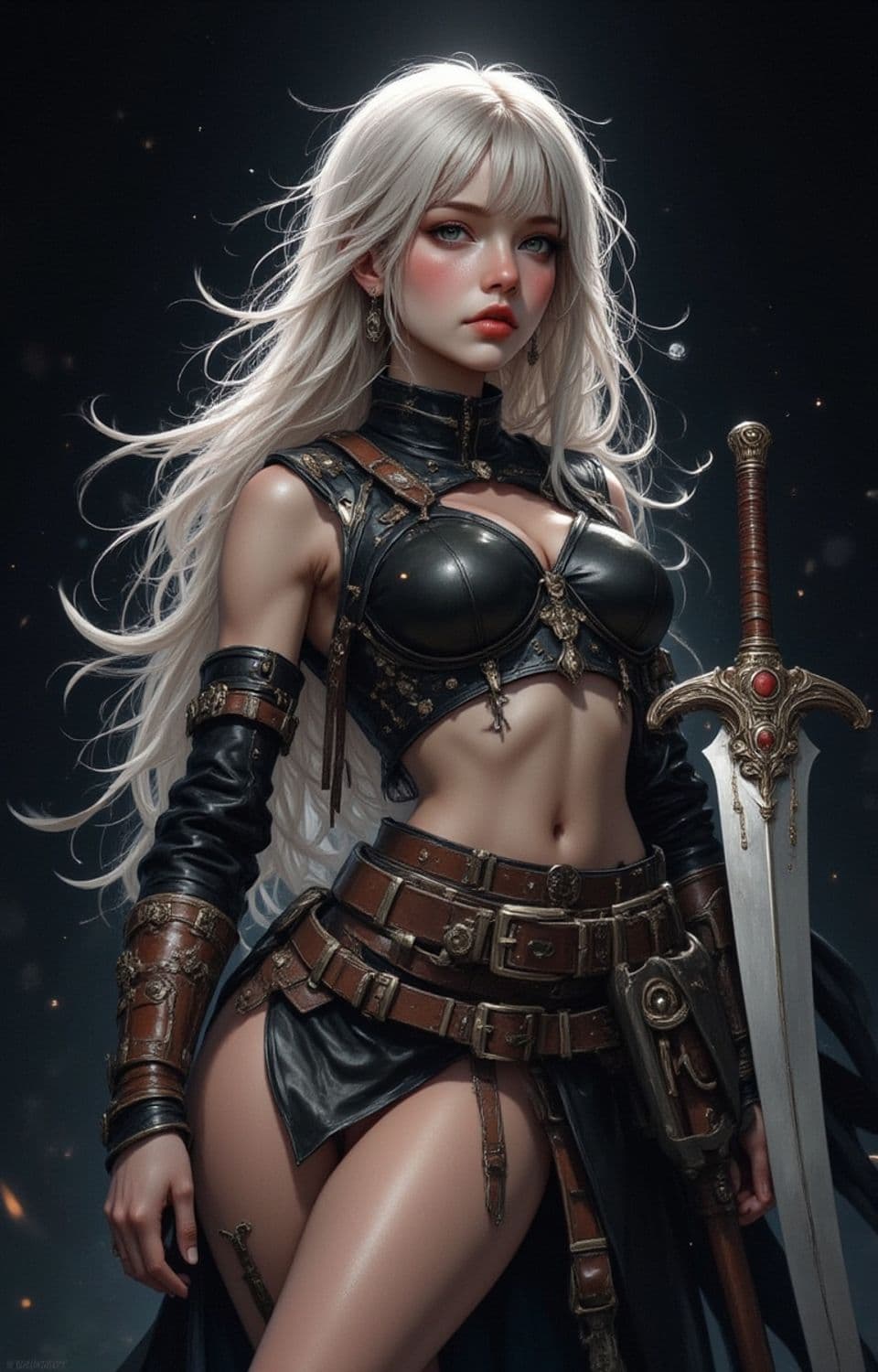 A striking depiction of a fantasy warrior with long, flowing white hair. She is adorned in intricately detailed leather armor, featuring ornate metal accents and buckles. Her confident expression is complemented by her poised stance with a large, decorated sword. The dark background allows her to stand out prominently, giving a sense of strength and mystery.