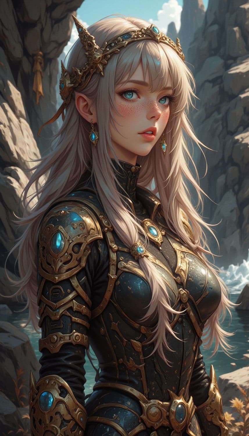 A fantastical female warrior stands gracefully in a rocky landscape beside a stream. She has flowing silver hair adorned with a golden crown decorated with blue gems. Her armor is intricately detailed with gold and blue accents, exuding a sense of strength and elegance.