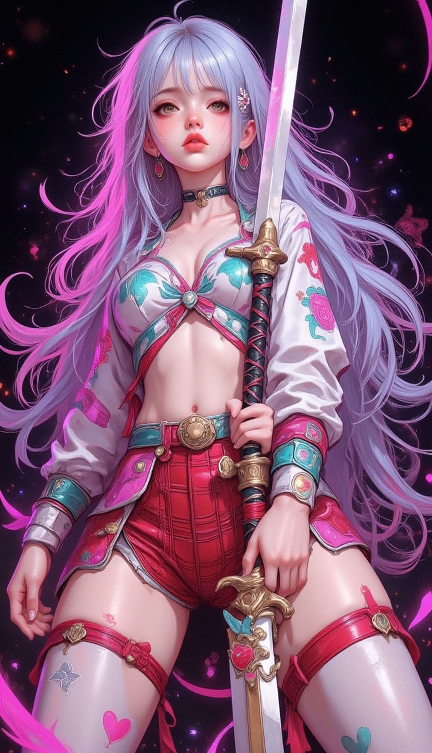 The image showcases a fantasy character with long, flowing purple hair that shifts to vibrant pink tones. She wields a large, ornate sword with a detailed hilt, shimmering with magical energy. Her attire is a blend of intricate patterns and vibrant colors, featuring a cropped top with floral accents and high-waisted shorts. Her arm is embellished with detailed armor pieces and the background is a cosmic scene filled with glowing particles and ethereal swirls.