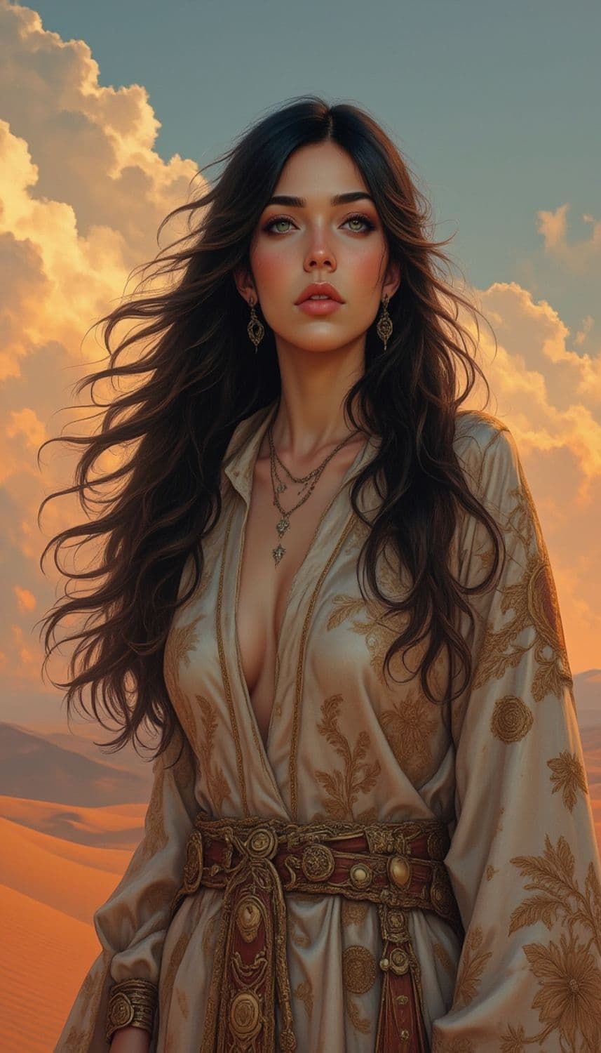 The image features a striking woman with long, flowing brunette hair against a dramatic desert backdrop with vibrant clouds. She wears an ornately patterned robe with a deep neckline, accessorized with layered necklaces and intricate earrings. Her gaze is focused and serene, adding an ethereal quality to the scene.