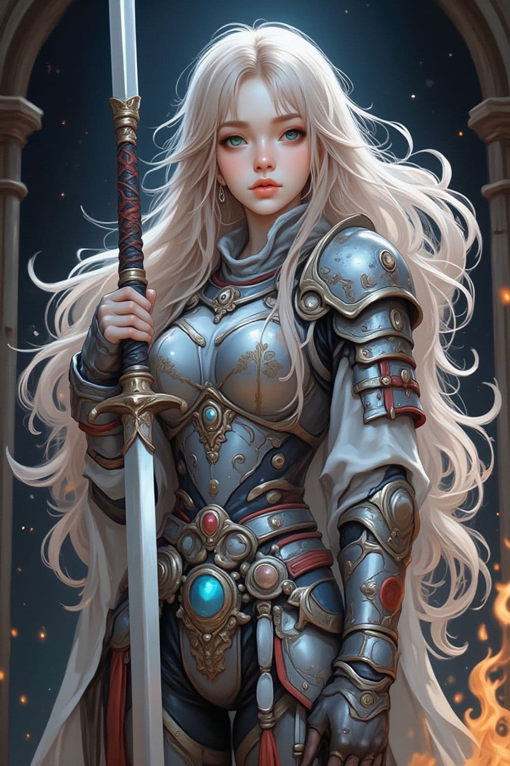A character with long, flowing white hair and striking green eyes stands confidently in ornate, intricately detailed armor. The armor is adorned with decorative jewels and patterns, featuring elements of silver and gold hues. She wields a large sword with a golden hilt, exuding an aura of strength and grace. Behind her, there is an archway with subtle, glowing embers floating in the air.