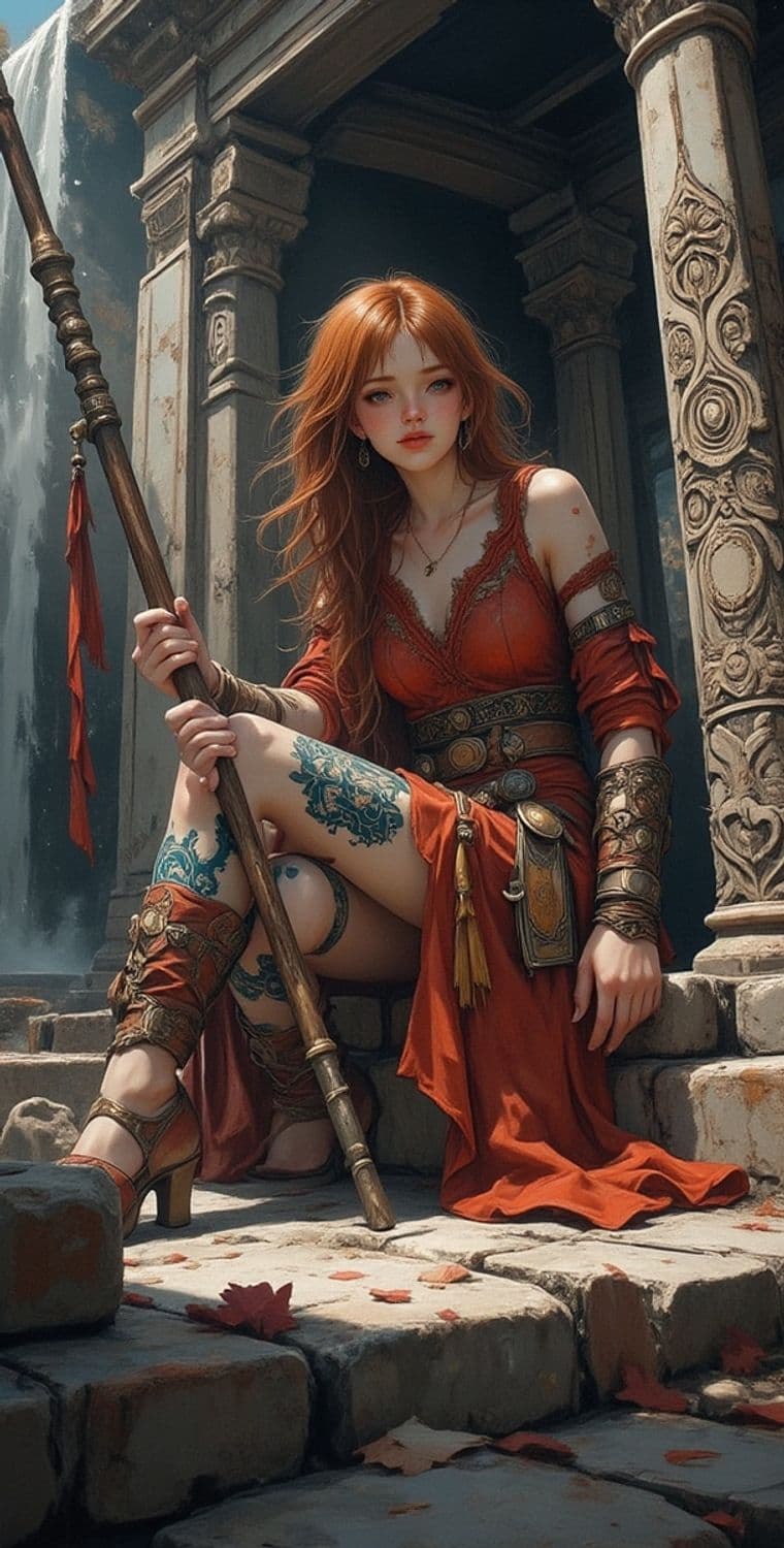 The image depicts a warrior sitting amidst ancient ruins. The warrior has long red hair and wears an intricately designed red outfit paired with metallic armor pieces. She holds a staff, and there are detailed tattoos on her leg. The setting is rich with detail, featuring a waterfall and ornate stone architecture.