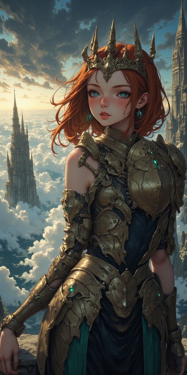 A striking red-haired woman stands on a ledge above a sea of clouds, gazing confidently into the distance. She wears elaborate golden armor adorned with turquoise gemstones and a crown of sharp spikes, evoking an aura of regal authority. The background features towering spires rising from the clouds, adding to the ethereal and fantastical atmosphere.
