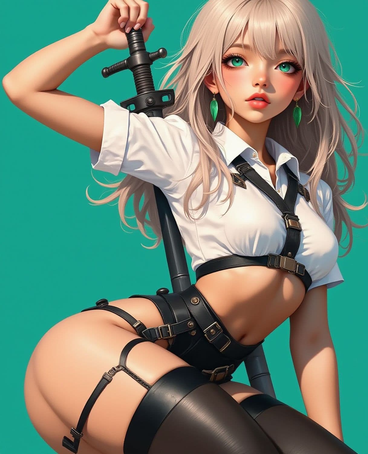 The image depicts an anime-style character with long blonde hair, striking green eyes, and a confident pose. She wears a harness outfit over a white shirt, accessorized with green leaf-shaped earrings. The character holds a large sword behind her back.