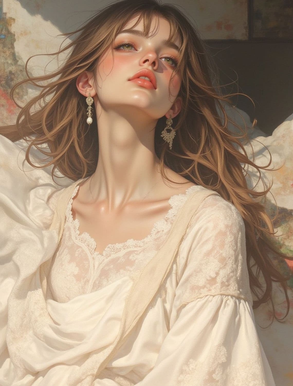 The image portrays an ethereal woman with flowing brown hair, gazing upward. She wears a lace-adorned white dress with puffed sleeves, evoking a sense of elegance and serenity. Her soft, peachy makeup complements her delicate features, highlighted by a pair of intricate earrings. The background features an abstract mix of soft colors, enhancing the dreamy atmosphere.