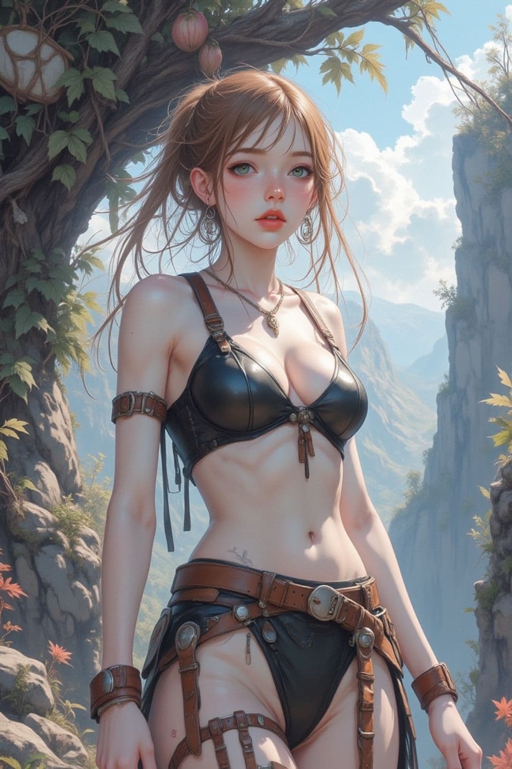 A young woman stands confidently in a rugged, natural setting. She wears a black leather warrior outfit adorned with straps and buckles. Her long brown hair is tied back, highlighting her striking blue eyes and gentle expression. The background features lush green foliage and rocky cliffs under a bright blue sky, adding to the adventurous and mystical atmosphere.
