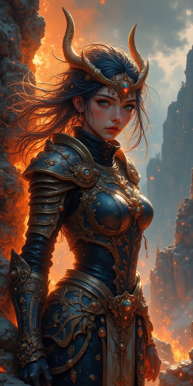 A striking female warrior stands against a backdrop of molten lava and rocky cliffs. She wears ornate gold and blue armor adorned with intricate designs and gemstones. Her hair is dark and flows wildly around her, with large, curved horns emerging from her head. The atmosphere is fierce and otherworldly, with fiery elements adding to the dramatic scene.
