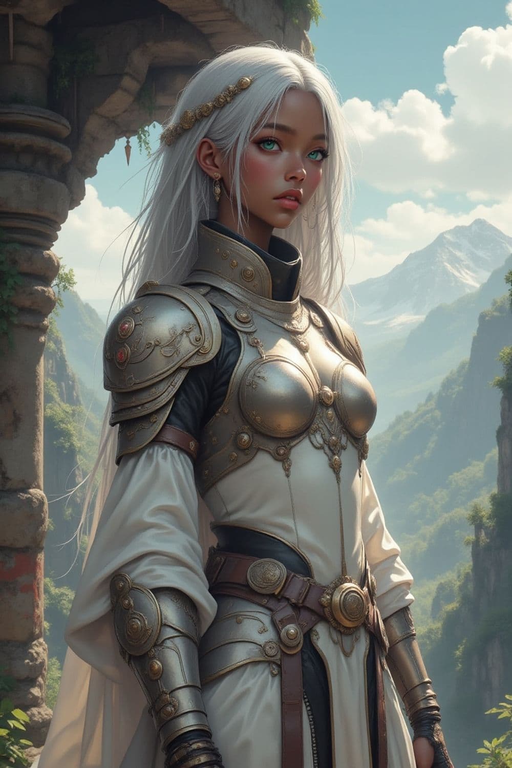 A fantasy portrait featuring a young woman with long white hair, adorned with a delicate gold headpiece. She is wearing intricately designed silver and gold armor over a flowing cream-colored gown. The background reveals a picturesque landscape with towering mountains and lush greenery, under a clear blue sky.