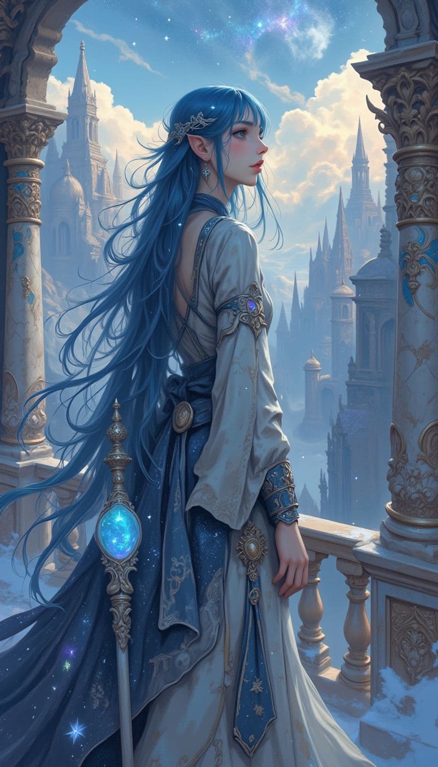 A fantasy scene featuring a young woman with long blue hair adorned with a delicate tiara and earrings, standing on a balcony in a mystical city. She wears an elegant gown with intricate patterns. The sky is clear with stars and a faint nebula visible. Ornate pillars and distant spires contribute to the enchanting atmosphere.