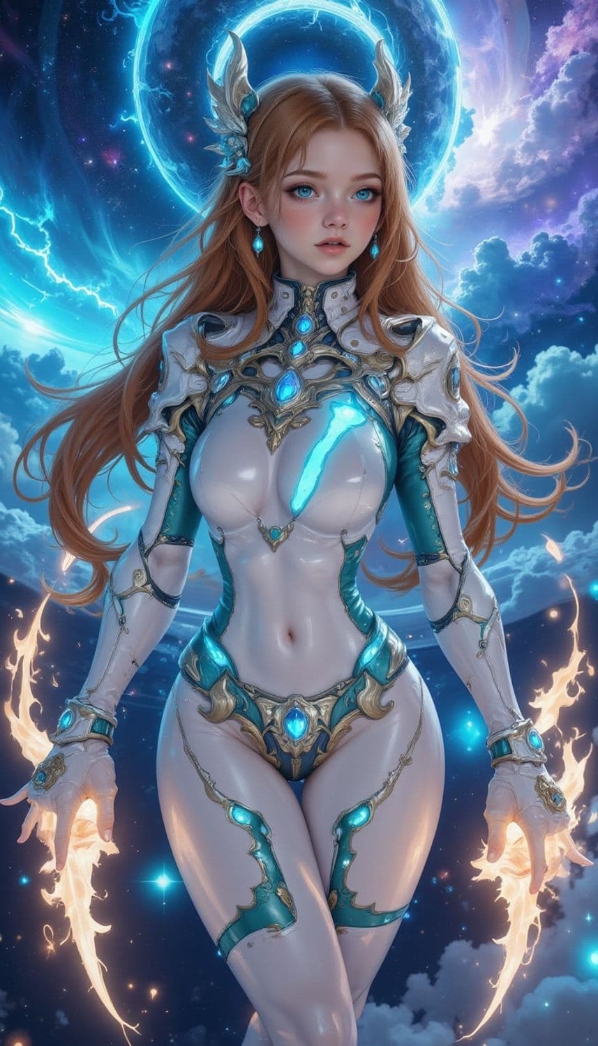 A mystical female figure stands against a celestial backdrop, her suit adorned with luminous blue gemstones. Her long, flowing hair complements the ethereal glow of the surrounding space, and her piercing blue eyes add to her captivating presence. She holds fiery, energy-like blades in each hand, and intricate, metallic armor accentuates her form while lending an air of otherworldly majesty.