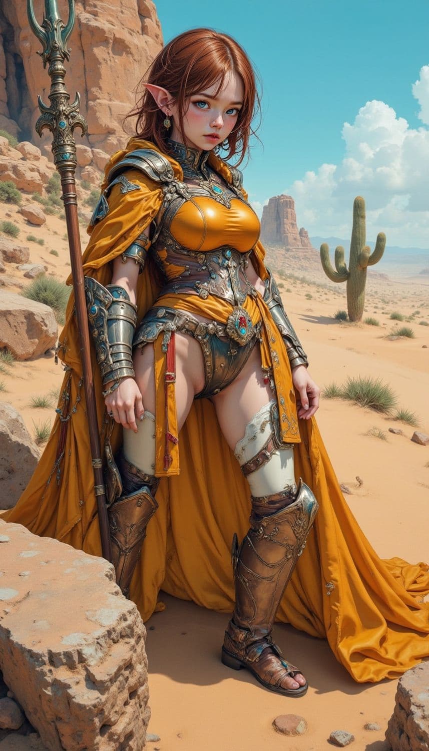 A fantasy elven warrior stands confidently in a desert landscape. She has pointed ears and vibrant red hair, her piercing eyes fixated on the horizon. The intricate armor she wears glimmers under the sun, adorned with blue jewels and golden accents. A flowing mustard-yellow cloak drapes elegantly behind her. In her hand, she holds a tall, ornate staff. The backdrop features rocky formations and a solitary cactus under a bright blue sky with fluffy white clouds.