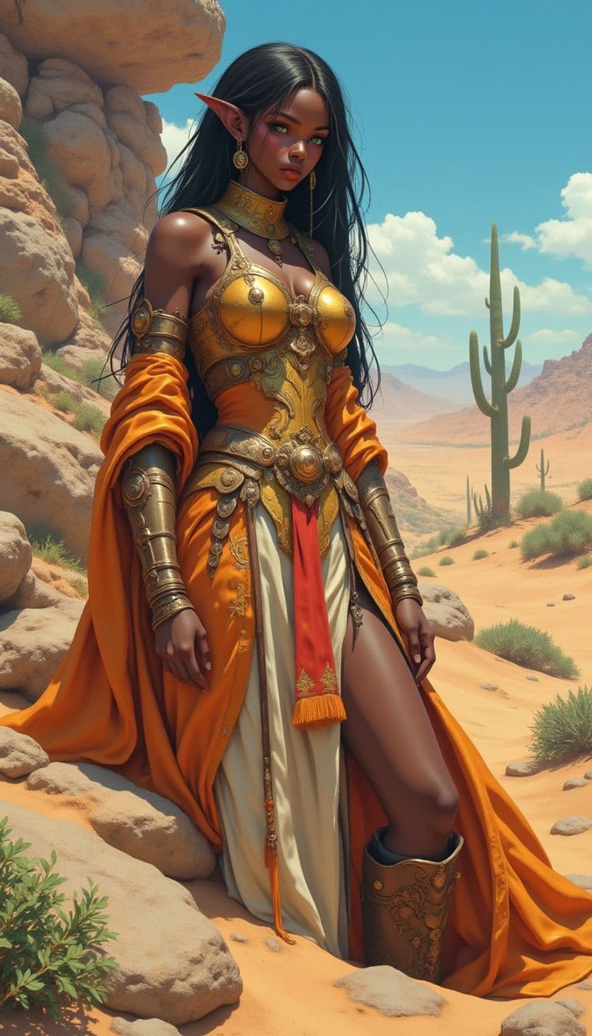 A striking fantasy character stands in a sunlit desert landscape, adorned in ornate golden armor and draped in a flowing orange robe. Her elven ears, framed by long black hair, add to her enchanting presence. She stands confidently among rocks and cacti, embodying strength and elegance.