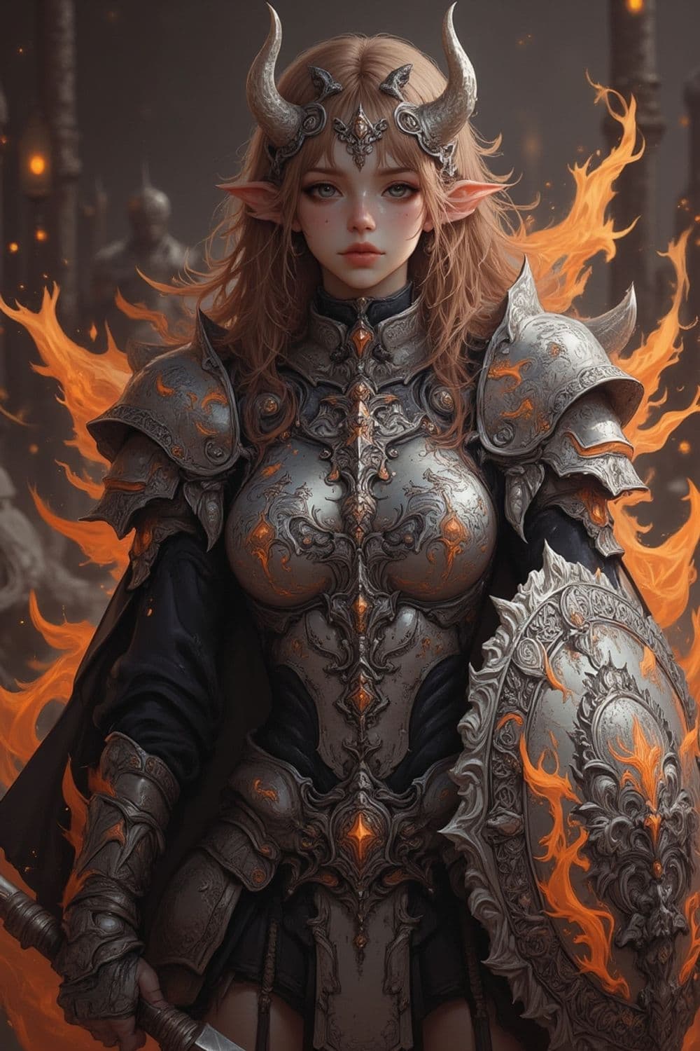 A warrior stands adorned in ornate silver armor with intricate patterns and glowing orange accents. She has long, flowing hair and wears a crown with small horns on her head. Her eyes are piercing, and her expression is resolute. Fiery, ethereal flames emanate around her, adding to her formidable presence. In her hand, she holds a dagger, and a detailed shield is slung prominently on her arm.