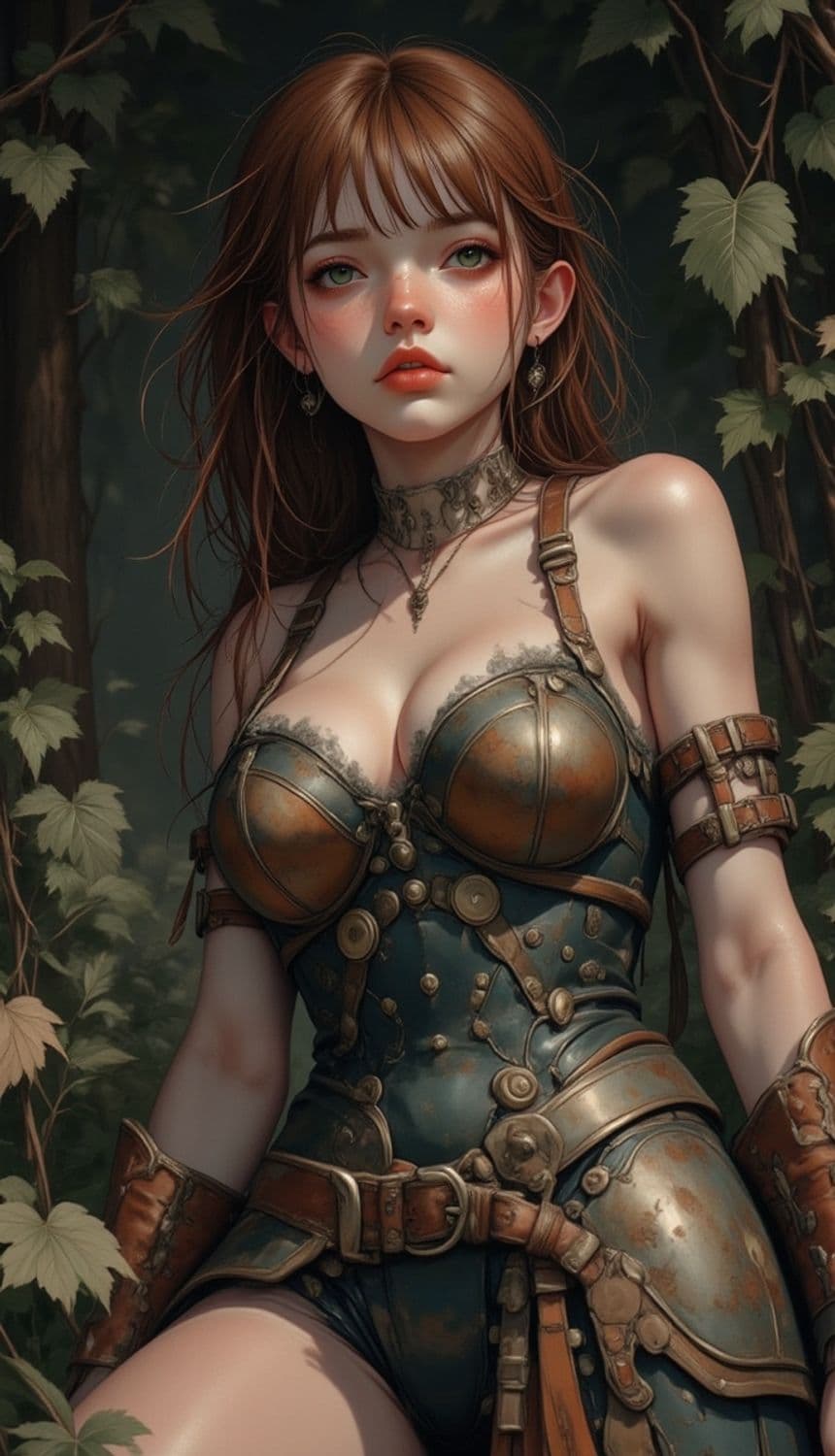 The image features a young woman with long brown hair set against a backdrop of lush foliage. She is clad in a detailed, metallic armor with intricate straps and a lace embellished bodice. Her expression is serene yet intense, with a subtle blush on her cheeks. The background is filled with soft, verdant leaves and trees, adding to the mystical atmosphere.