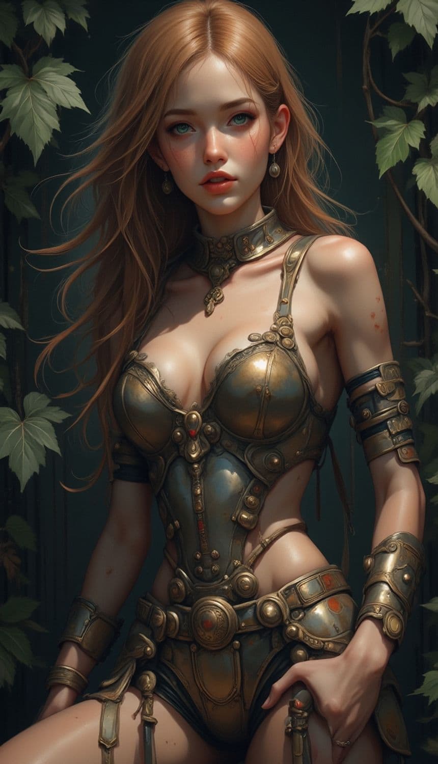 A striking female character stands amidst a dark, leafy background. She has long, flowing hair and is adorned in ornate, metallic armor featuring intricate designs and embellishments. Her expression is serious yet captivating, and her presence is strong and commanding.