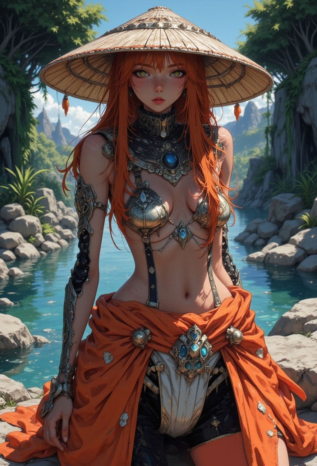 A striking figure stands by a tranquil waterway, surrounded by rocky banks and lush greenery. She has long, flowing red hair and bright eyes, wearing ornate armor adorned with blue gems. Her attire includes a large, circular straw hat casting a shadow over her expressive face. The scene evokes a mystical, fantastical atmosphere.