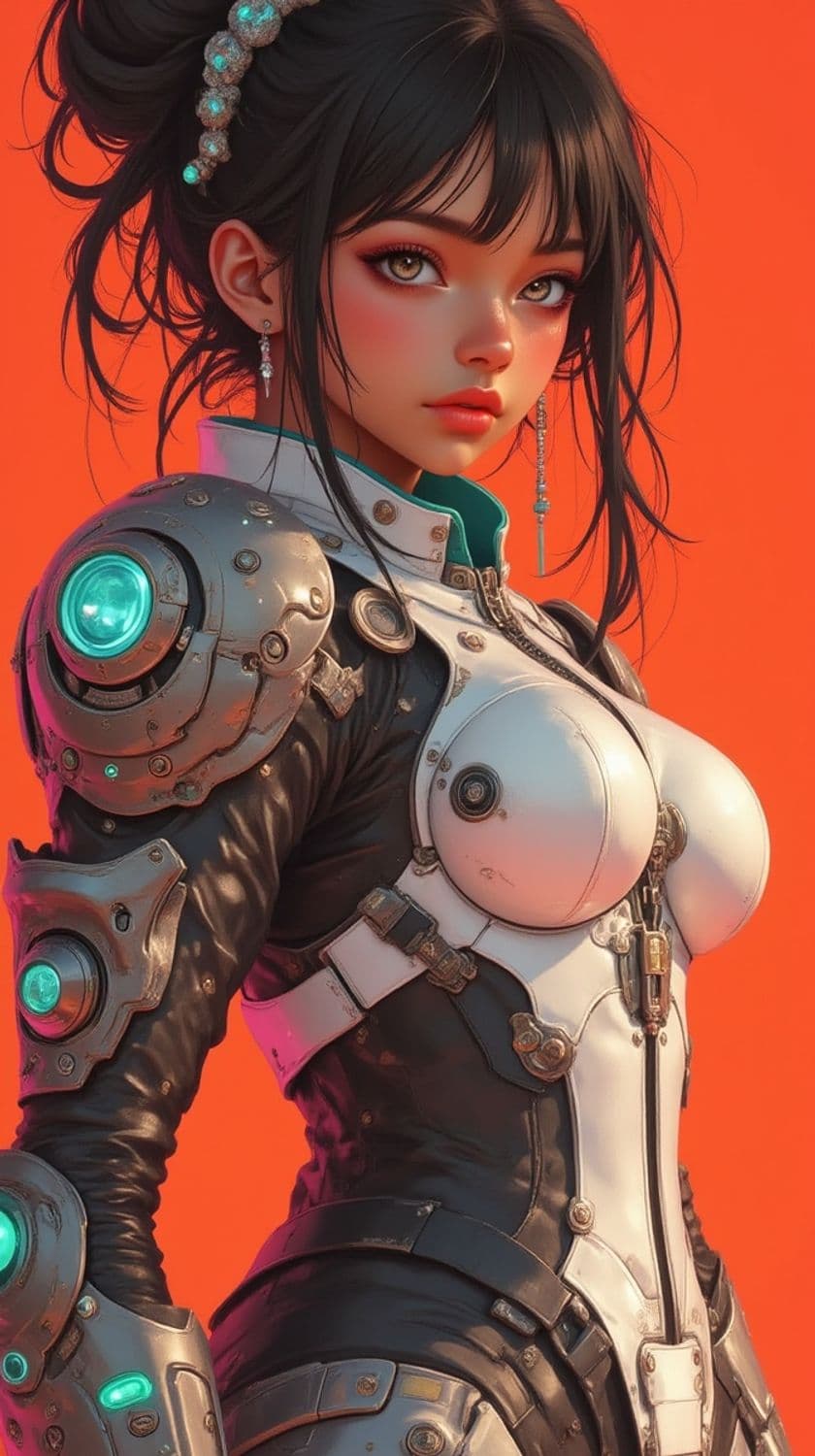 The image showcases a stylized female character with intricate sci-fi armor. Her hair is styled in an updo adorned with pearlescent accessories. The armor is detailed with metallic elements and glowing turquoise accents, highlighting her shoulders and forearms. The background is a solid vibrant orange, enhancing the futuristic theme.