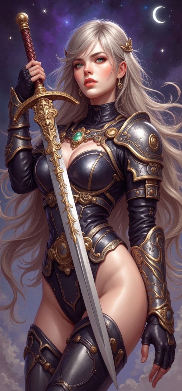 A warrior stands under a starry sky with a crescent moon in the background. She has long silver hair and wears ornate, armored attire with intricate golden patterns and a prominent emerald on her chest plate. Her expression is confident as she holds an elegant sword upright in front of her. Her armor emphasizes strength and femininity, blending leather and metal with detailed craftsmanship.