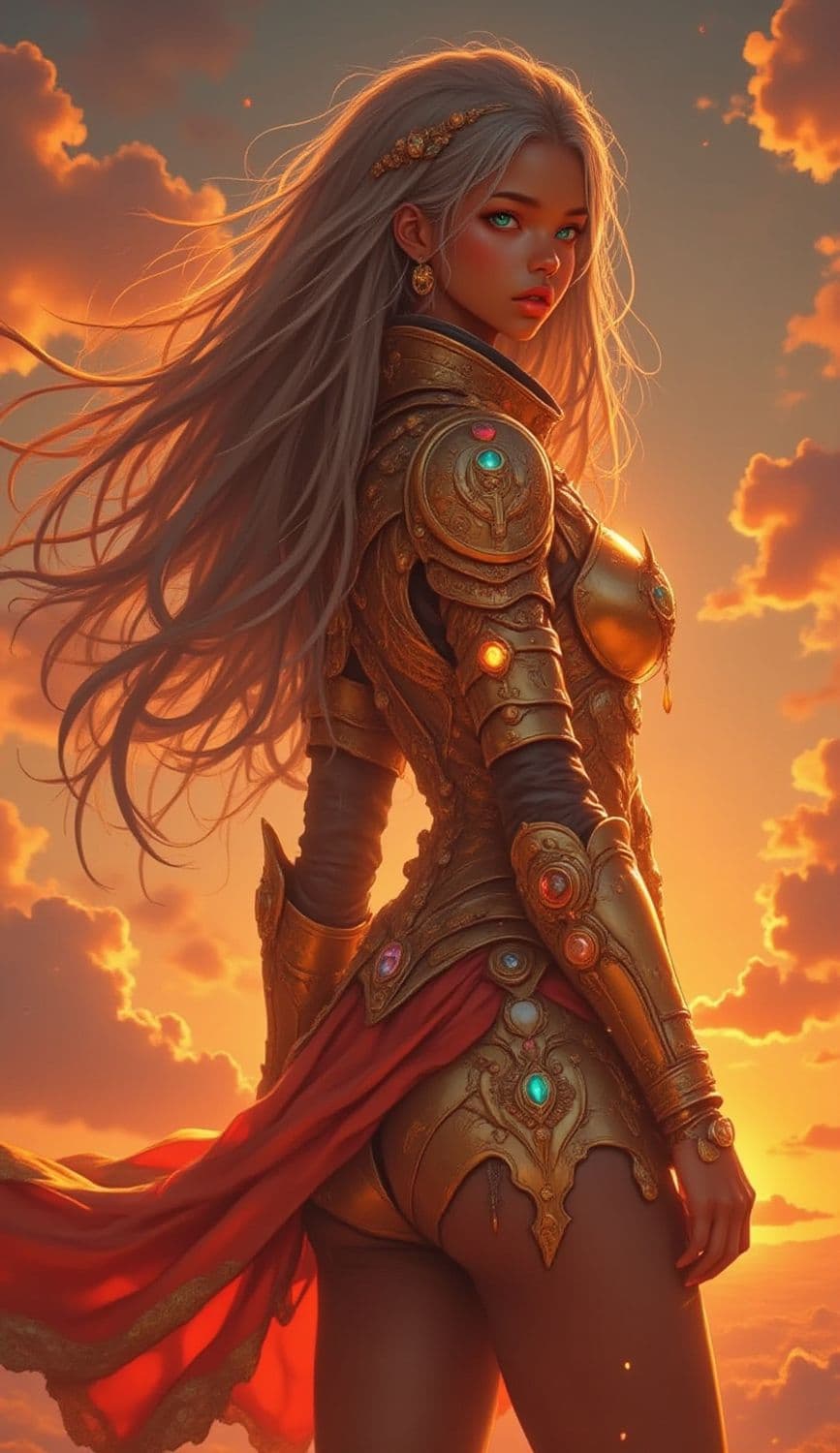 A striking fantasy scene featuring a woman with long, flowing silver hair gazing assertively at the viewer. She is clad in ornate, golden armor embellished with colorful gemstones. The background is an orange, glowing sky with soft, scattered clouds, creating a warm and mystical atmosphere.