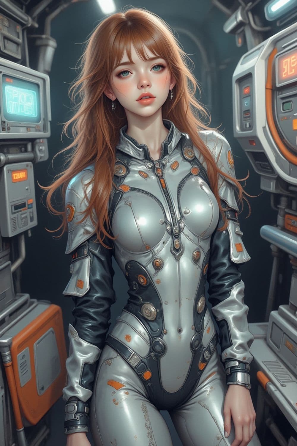 A futuristic female figure with auburn hair stands in a sci-fi environment. She wears a sleek, metallic space suit adorned with orange and silver accents, emphasizing a blend of advanced technology and elegance. The background features high-tech control panels and displays, suggesting a spacecraft or space station setting.