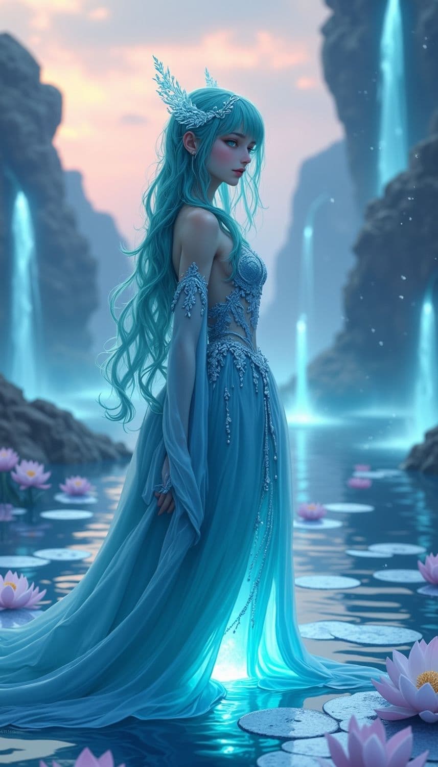 In a mystical, ethereal realm of floating, luminescent waterfalls under a sky painted with the colors of a serene twilight, a captivating female figure stands poised on a shimmering, translucent water lily platform. Her attire is a flowing, elegant dress crafted from a fabric that seems to capture the essence of aquatic grace, blending shades of deep sapphire and shimmering aquamarine. Her hair, a striking shade of oceanic teal, cascades down her back in intricate, flowing waves, framing a face with delicate, serene features and a gentle, knowing smile. Her eyes, a mesmerizing shade of seafoam green, seem to reflect the mysteries of the watery world. She wears a delicate tiara adorned with tiny, luminescent water droplets and silver coral patterns, enhancing her celestial and otherworldly presence. The background is a breathtaking scene of luminescent waterfalls and gentle, glowing streams of twilight light that weave through the realm, creating a serene and enchanting atmosphere. The style is a blend of fantasy and aquatic elegance, with a focus on cool color tones and intricate detailing, creating a mesmerizing and otherworldly atmosphere.