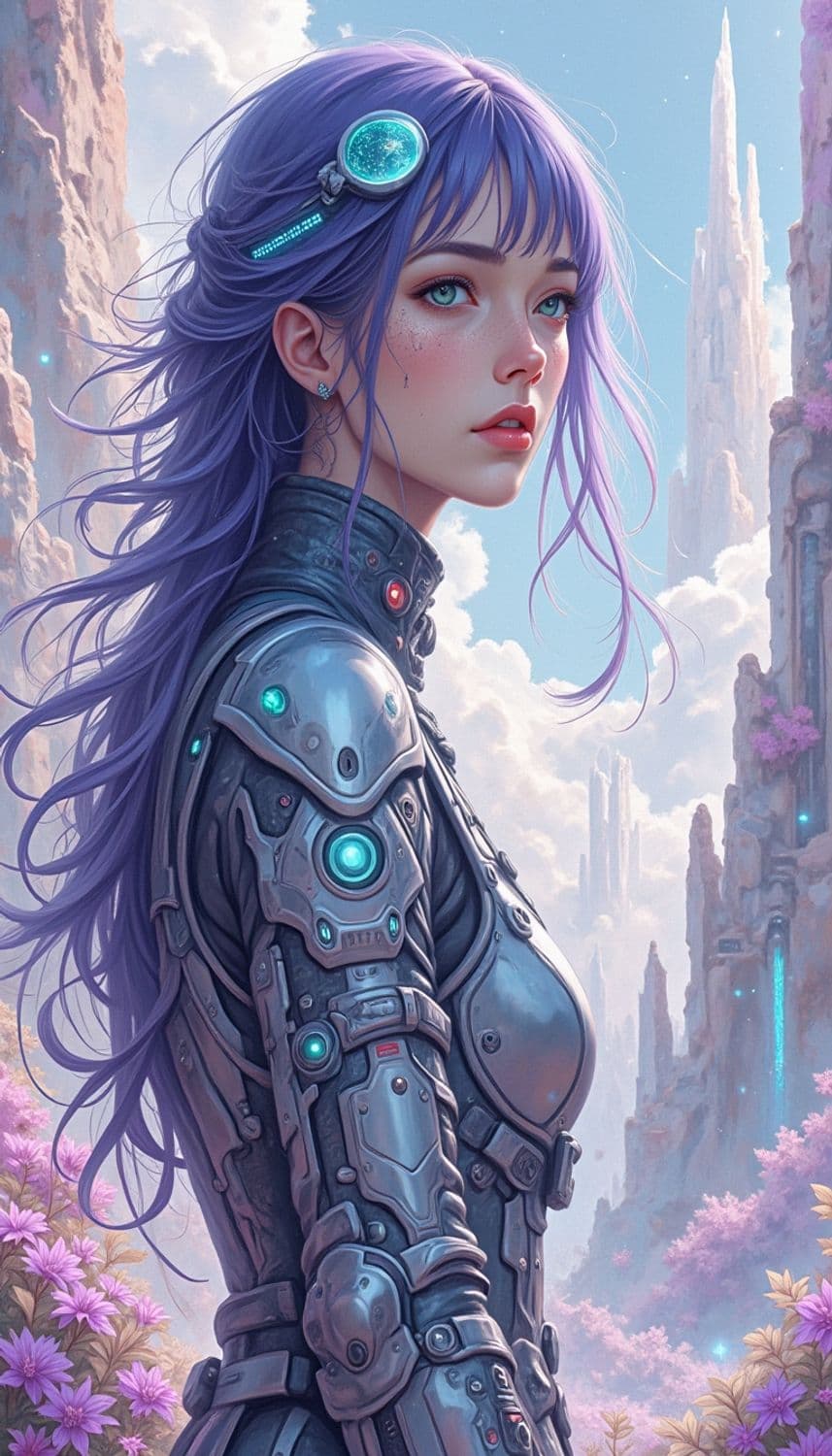 In a dreamlike sci-fi setting, a captivating female character stands amidst a vast, luminescent alien landscape. Her attire is a sleek, form-fitting exosuit that shimmers with metallic hues of teal and silver, adorned with intricate circuitry patterns that pulse with a soft glow. Her hair, a striking shade of deep violet, flows gracefully around her shoulders, framing a face with ethereal, otherworldly features. Her eyes, a mesmerizing shade of emerald green, seem to reflect the mysteries of the universe. She wears a delicate, translucent visor that displays holographic data, enhancing her enigmatic presence. The background is a breathtaking panorama of towering crystalline structures and floating, bioluminescent flora that cast an ambient glow over the scene. The style is a fusion of sci-fi and fantasy, with a focus on vivid colors and intricate detailing, creating a mesmerizing and otherworldly atmosphere.