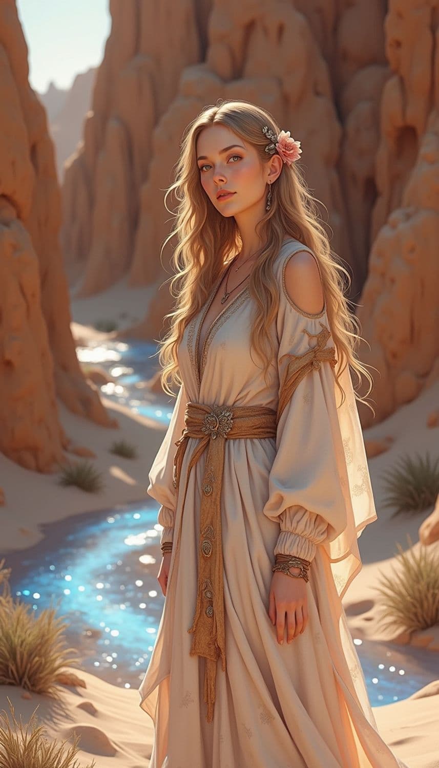 In a mystical, ethereal realm of floating, luminescent sand dunes under a sky painted with the colors of a tranquil dawn, a captivating female figure stands poised on a shimmering, translucent sand bridge. Her attire is a flowing, elegant tunic crafted from a fabric that seems to capture the essence of desert serenity, blending shades of soft peach and shimmering bronze. Her hair, a striking shade of sunrise gold, cascades down her back in intricate, flowing waves, framing a face with delicate, serene features and a gentle, knowing smile. Her eyes, a mesmerizing shade of desert rose, seem to reflect the mysteries of the arid world. She wears a delicate headpiece adorned with tiny, luminescent desert blooms and bronze leaves, enhancing her celestial and otherworldly presence. The background is a breathtaking scene of luminescent sand dunes and gentle, glowing streams that weave through the realm, creating a serene and enchanting atmosphere. The style is a blend of fantasy and desert elegance, with a focus on warm color tones and intricate detailing, creating a mesmerizing and otherworldly atmosphere.