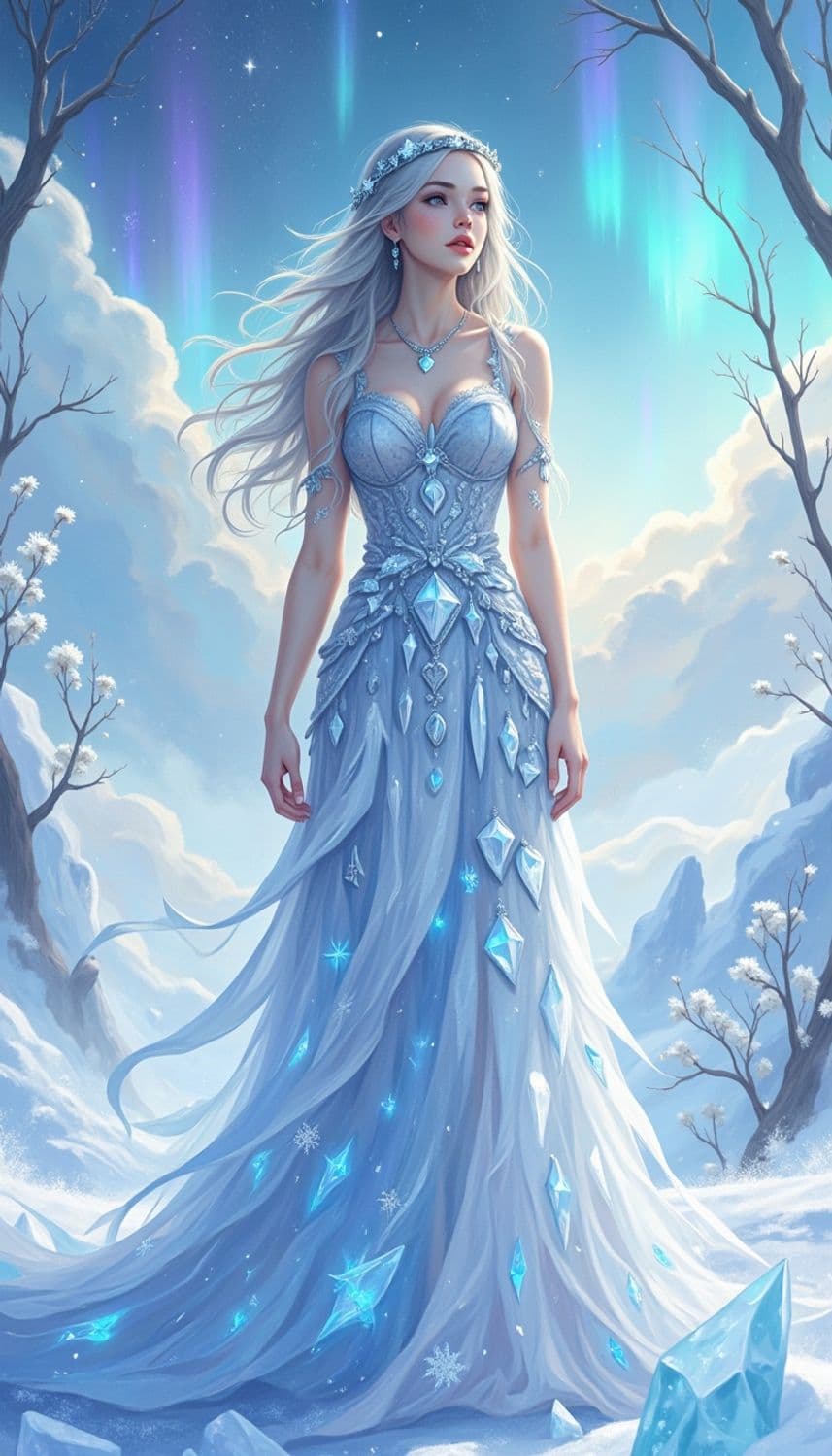 In a mystical, ethereal realm of floating, luminescent ice crystals under a sky painted with the vibrant colors of a polar aurora, a captivating female figure stands poised on a shimmering, translucent ice platform. Her attire is a flowing, elegant gown crafted from a fabric that seems to capture the essence of Arctic serenity, blending shades of icy blue and shimmering silver. Her hair, a striking shade of frosty white, cascades down her back in intricate, flowing waves, framing a face with delicate, serene features and a gentle, enigmatic smile. Her eyes, a mesmerizing shade of glacial blue, seem to reflect the mysteries of the frozen world. She wears a delicate tiara adorned with tiny, luminescent ice crystals and silver vines, enhancing her celestial and otherworldly presence. The background is a breathtaking scene of luminescent ice crystals and gentle, glowing streams of polar light that weave through the realm, creating a serene and enchanting atmosphere. The style is a blend of fantasy and icy elegance, with a focus on cool color tones and intricate detailing, creating a mesmerizing and otherworldly atmosphere.