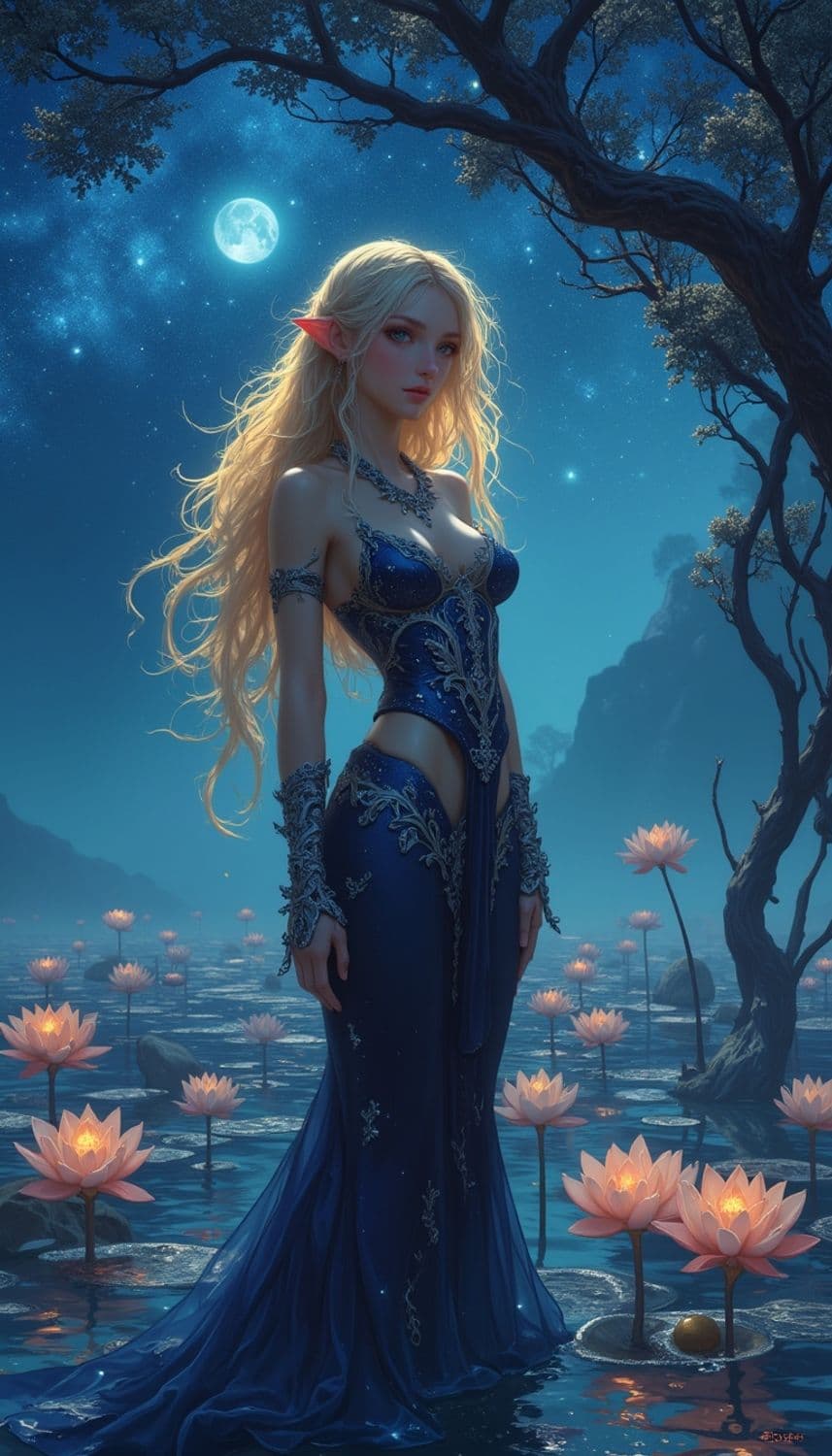 In a mystical, enchanted lagoon under a starlit sky, a captivating female figure stands on a shimmering, moonlit shore. Her attire is an elegant, flowing gown crafted from a fabric that seems to capture the essence of a night sky, blending shades of deep navy and shimmering silver. Her hair, a striking shade of celestial gold, cascades down her back in intricate, flowing waves, framing a face with delicate, serene features. Her eyes, a mesmerizing shade of starry sapphire, seem to reflect the mysteries of the cosmos. She wears a delicate necklace made of intertwining celestial vines and tiny, luminescent sapphires, enhancing her mystical and otherworldly presence. The background is a breathtaking scene of luminescent water lilies and gentle, glowing streams that weave through the lagoon, creating a serene and enchanting atmosphere. The style is a blend of fantasy and celestial elegance, with a focus on cool color tones and intricate detailing, creating a mesmerizing and otherworldly atmosphere.