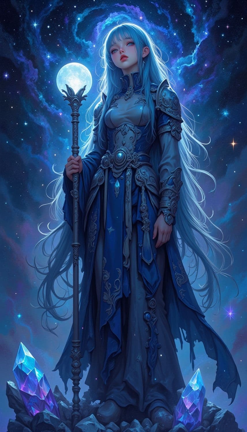 A mystical female figure stands amidst a cosmic backdrop. Her long, flowing blue hair cascades down her ornate, intricately designed armor, reflecting hues of silver and blue. She holds a staff crowned with a luminescent orb, reminiscent of a full moon, radiating an ethereal glow. The night sky behind her is filled with stars and swirling nebulae, forming a celestial aura. At her feet, crystalline structures catch the light, adding to the magical atmosphere of the scene.